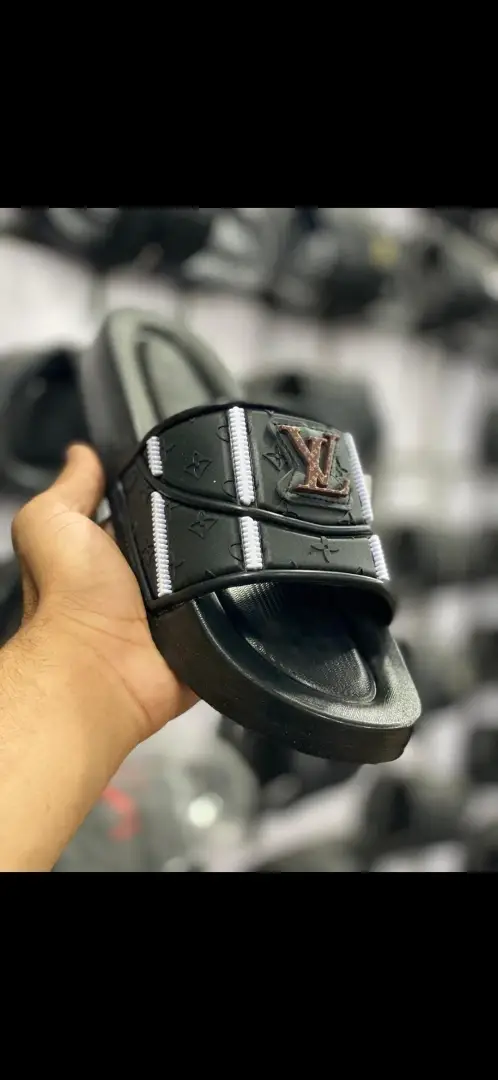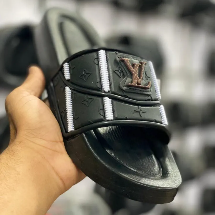 تميّز بإطلالة فاخرة مع هذا الشبشب الرجالي العصري المستوحى من تصاميم Louis Vuitton الشهيرة. يأتي بلون أسود جذاب مع لمسات أنيقة من النقوش البارزة على السير العلوي، بالإضافة إلى شعار "LV" الذهبي الذي يعكس الفخامة والرقي.