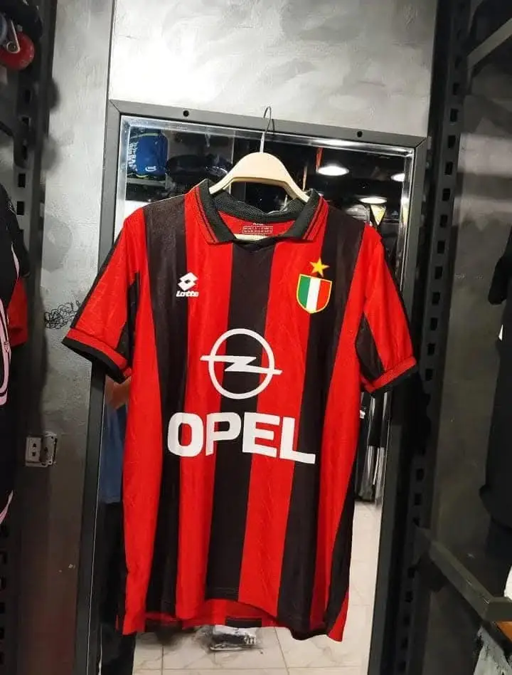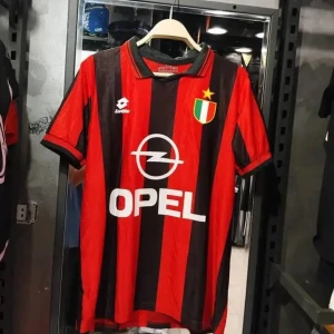 ارتدِ التاريخ بفخر مع هذا التيشيرت الكلاسيكي 🖤❤️ لنادي أيه سي ميلان الإيطالي، المستوحى من تصميمات التسعينات الذهبية ✨. يتميز القميص بخطوط ميلان الحمراء والسوداء الشهيرة، مع شعار "⚡Opel" الراعي الرسمي آنذاك، وشعار "🏷️ Lotto" على الصدر.